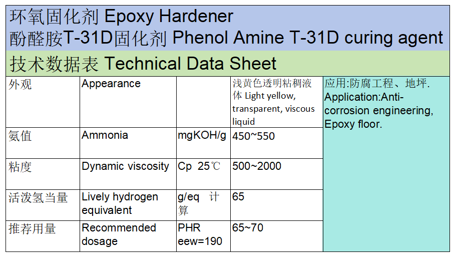 六、市場與發展 T31 固化劑因其性價比高、適用性廣,在國內環氧樹脂應用領域占據重要地位。隨著環保要求提升,市場逐漸向低 VOC(揮發性有機物)、水性化配方發展,T31 的水性改性產品(如水乳型酚醛胺固化劑)也在防腐、建筑領域獲得更多應用。